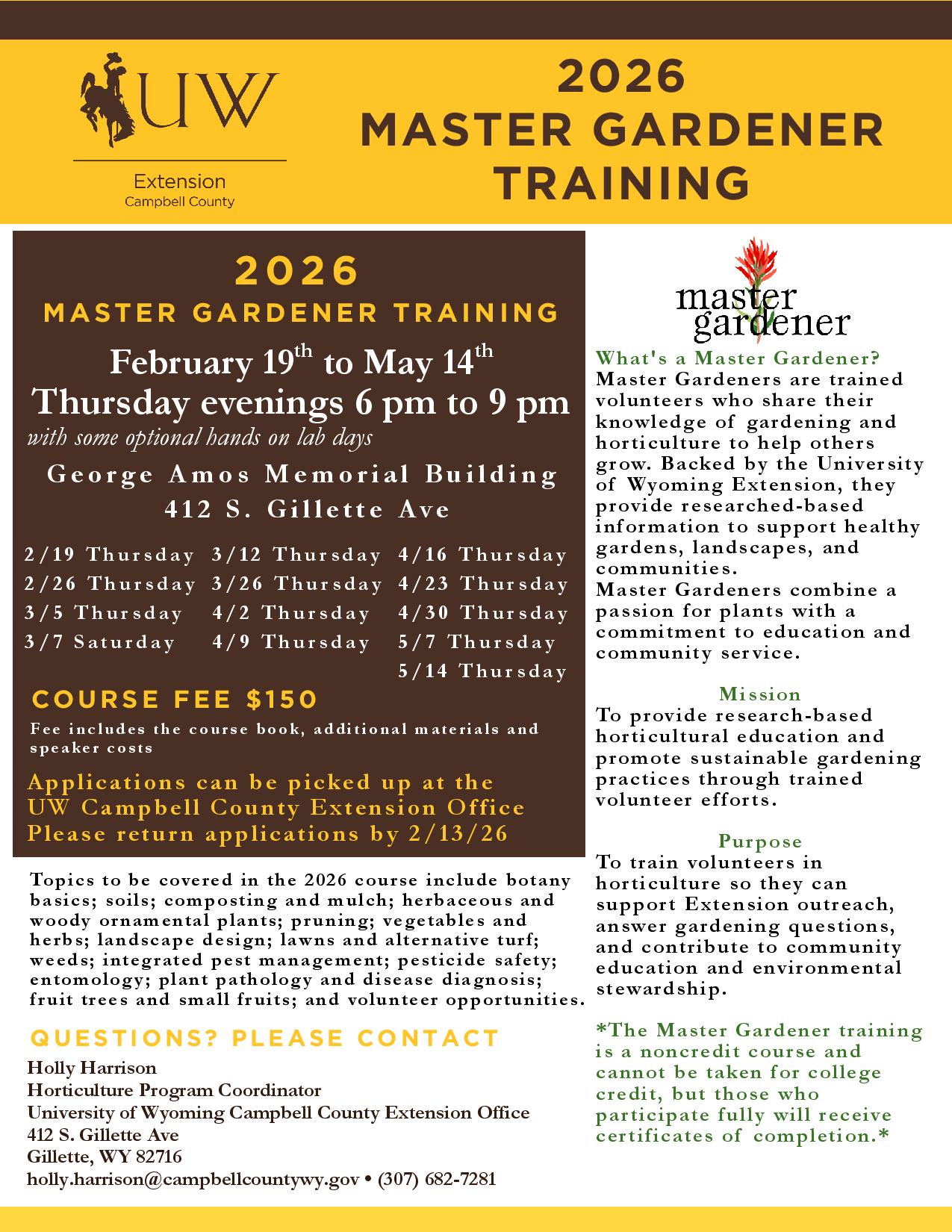 **2026 Master Gardener Training will be held in person from February 19th – May 14th.**