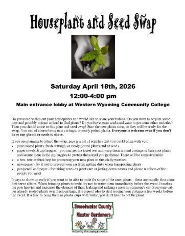 Join the Sweetwater County Master Gardeners for an afternoon plant and seed swap. Bring your extra houseplants, cuttings, or seeds and trade with fellow plant lovers in the community. Discover new plants, share your favorites, and connect with others who enjoy gardening.
