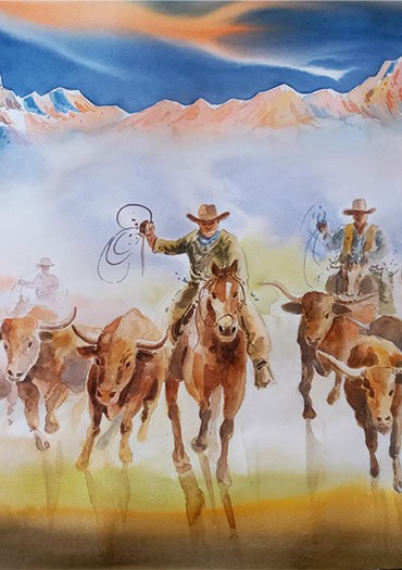 Santosh works exclusively in watercolor, using the medium to bring landscapes, animals, and cultural moments to life. His style combines realism with expressive detail, often focusing on iconic Wyoming imagery like horse riding, bull riding, and cattle ranching. Whenever possible, he sources his materials locally to reflect and support the region that inspires his work.